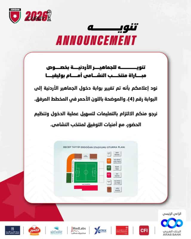 أصدر الاتحاد الأردني لكرة القدم إعلانًا رسميًا يوجهه إلى جماهير “النشامى”، يفيد بتعديل بوابة الدخول إلى الملعب، حيث أصبحت البوابة رقم 4 هي البوابة الجديدة المخصصة لهم، كما هو مبين في المرفق الموضح أدناه.
