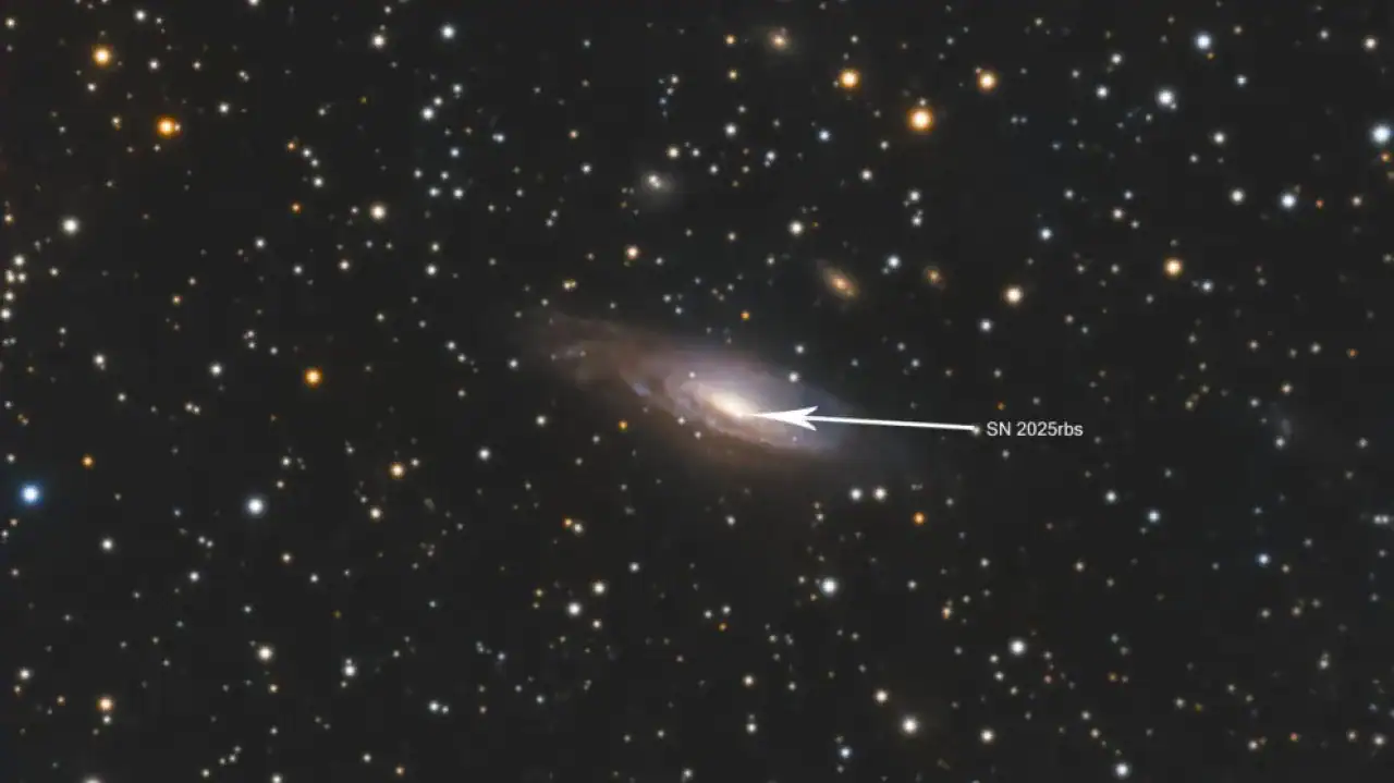 وأوضح السكجي أن المستعر الأعظم، المسمى SN 2025rbs (أو اختصارًا 2025rbs)، تم اكتشافه في 14 تموز 2025 في المجرة الحلزونية NGC 7331، الواقعة في كوكبة الفرس المجنح (بيغاسوس)، على مسافة تُقدَّر بـ40 مليون سنة ضوئية، أي ما يعادل 378 تريليون تريليون كيلومتر.
