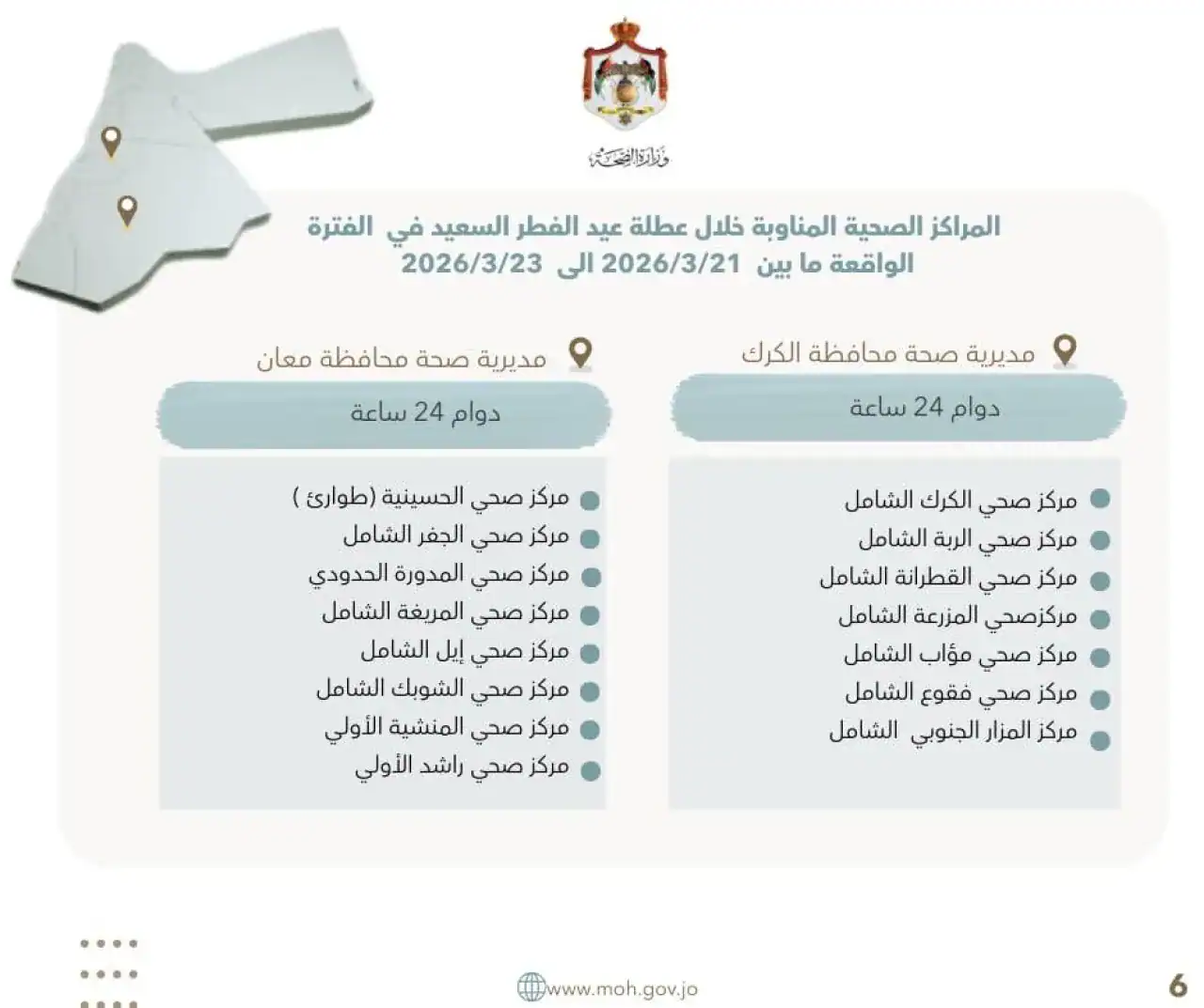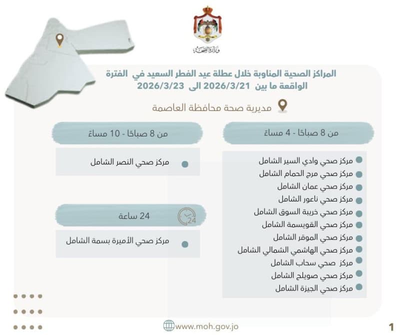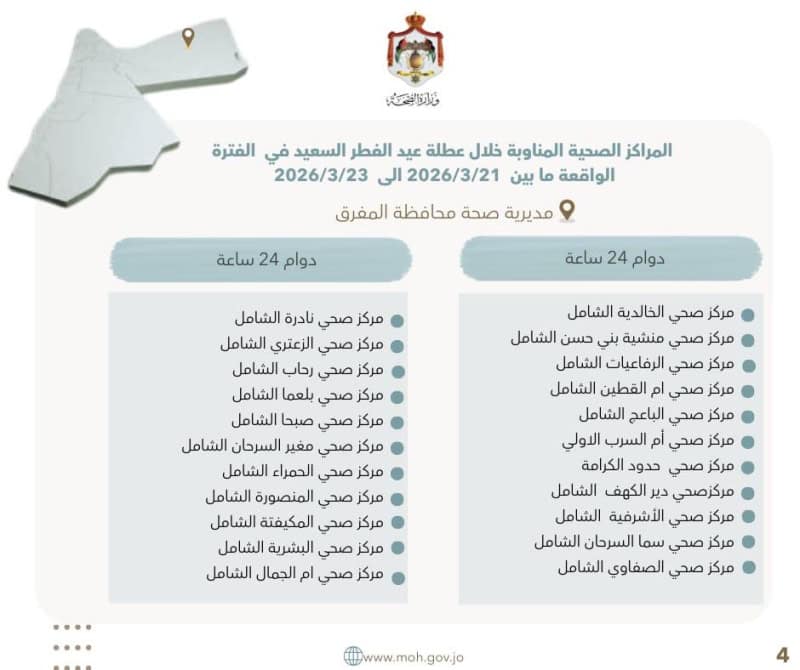 ومن المقرر أن تباشر هذه المراكز المحددة عملها بنظام المناوبة لتقديم الرعاية اللازمة، وذلك بدءاً من يوم 21 وحتى 23 من شهر آذار/مارس للعام 2026.