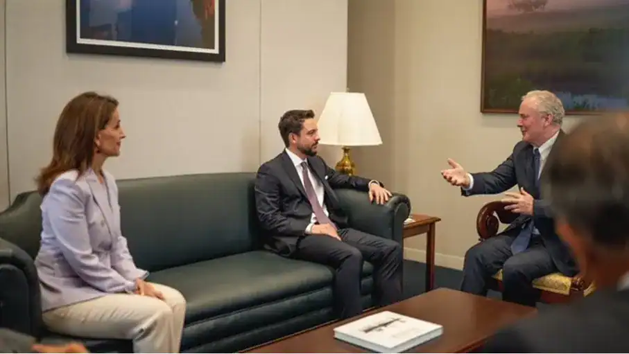 وفي لقاء مع السيناتور كريس فان هولين، عضو لجنتي المخصصات والعلاقات الخارجية في مجلس الشيوخ، شدد سموه على التزام الأردن بجهود التحديث، وتعزيز التهدئة في المنطقة، مثمناً مواقف فان هولين الداعمة لوقف الحرب على غزة.